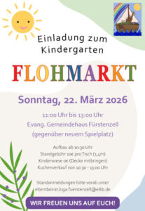 Der Elternbeirat unseres Kindergartens „Arche Noah“ veranstaltet am Sonntag, den 22. März einen Flohmarkt in und um das Evangelische Gemeindehaus am Kirchenweg 18. Standanmeldungen und weitere Infos im Flyer oder direkt beim Elternbeirat: elternbeirat.kiga.fuerstenzell@elkb.de